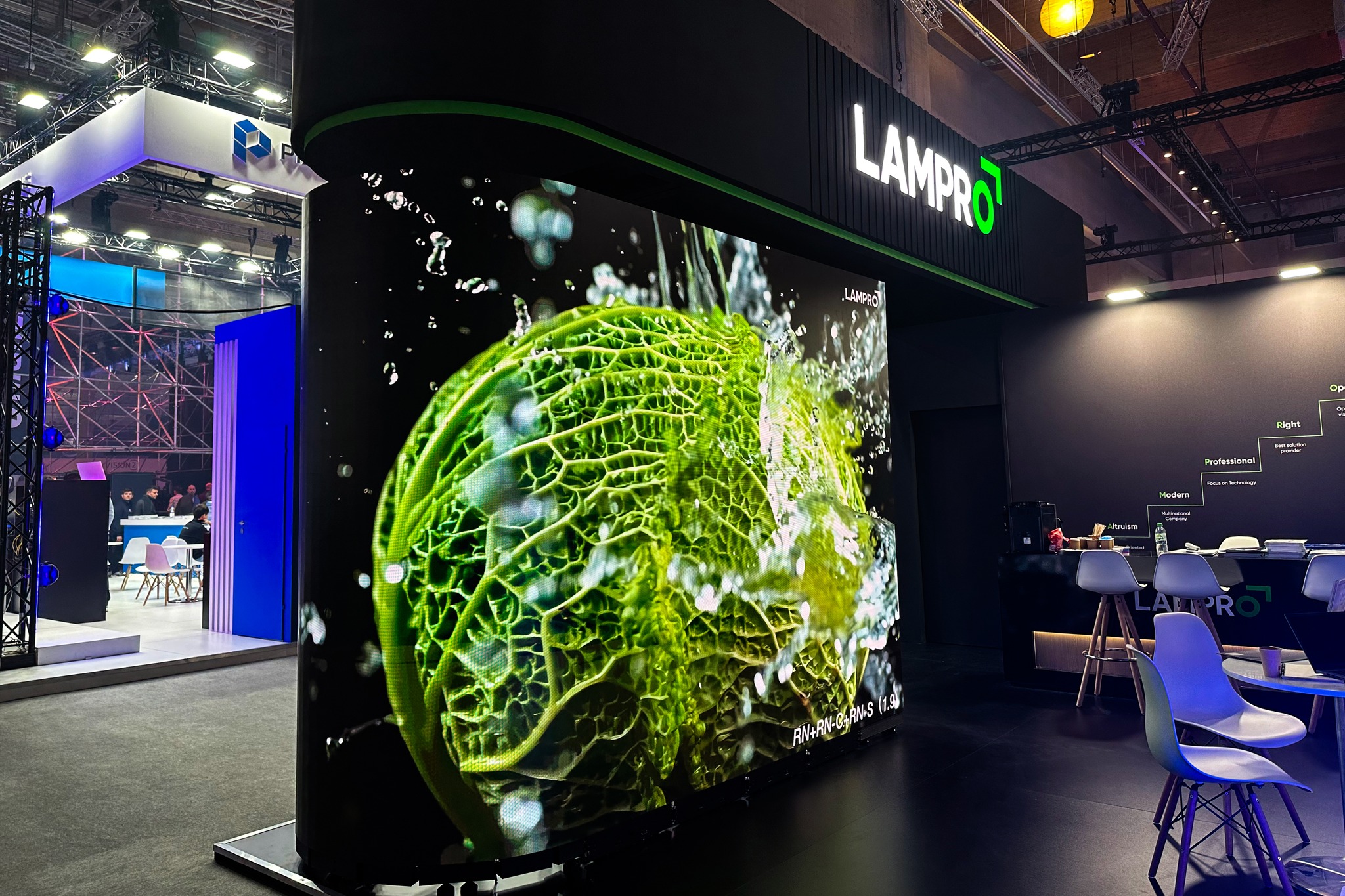 Một trong những ứng dụng gây ấn tượng mạnh tại gian hàng Lampro – dù không đặt ở vị trí trung tâm – chính là mô hình màn hình LED dạng đứng tùy biến, được lắp ghép theo hình dạng không đồng nhất. Hệ thống này kết hợp linh hoạt các dòng RN (GOB), RN-S (GOB) và RN-C Series, mang đến cái nhìn trực quan về khả năng tích hợp liền mạch giữa các cấu hình khác nhau trong cùng hệ sinh thái RN.